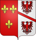 Parti, au premier de gueules à trois fleurs de lys d'or, au deuxième d'argent à la bande du premier accompagnée de deux aigles éployées du même