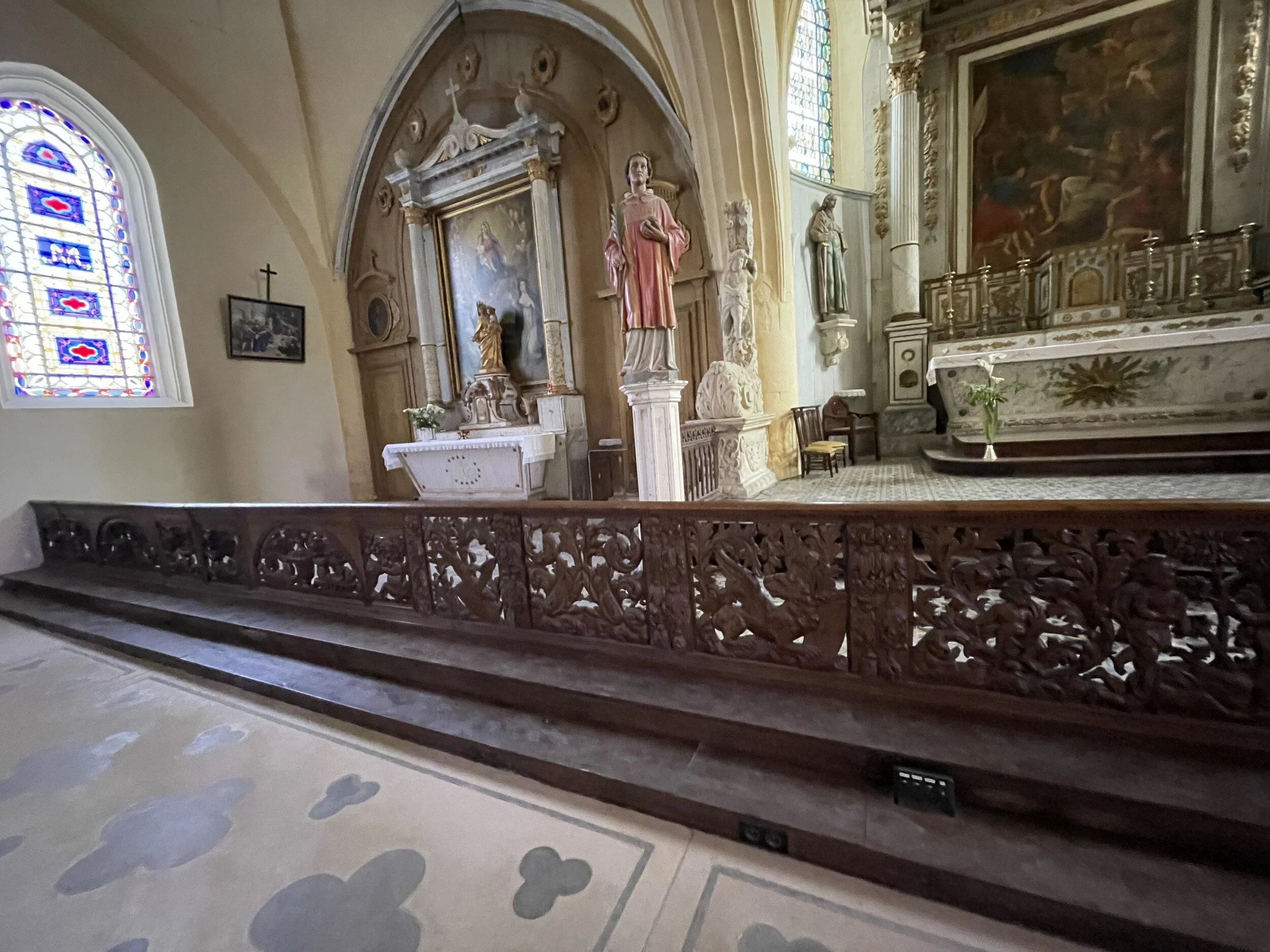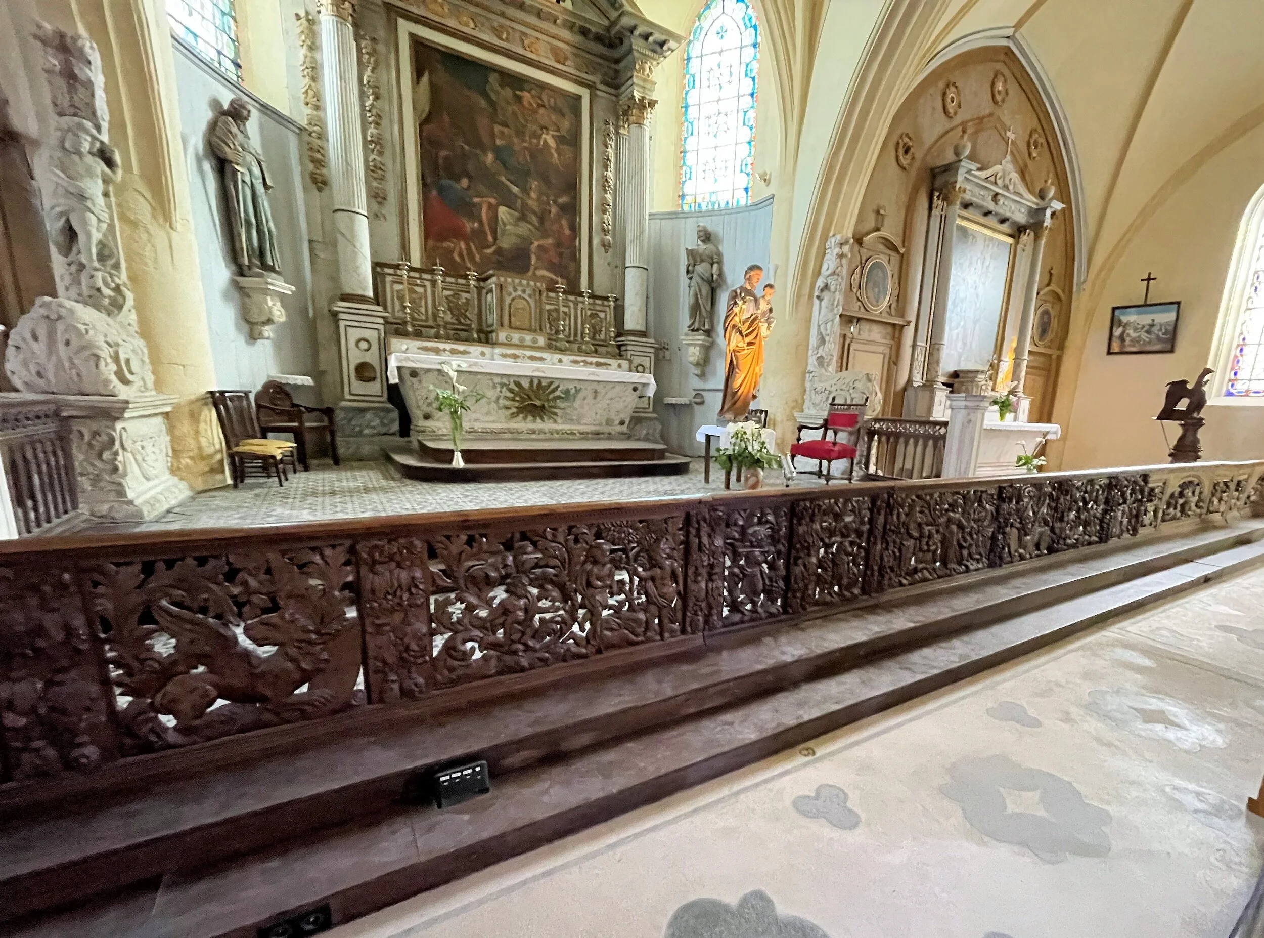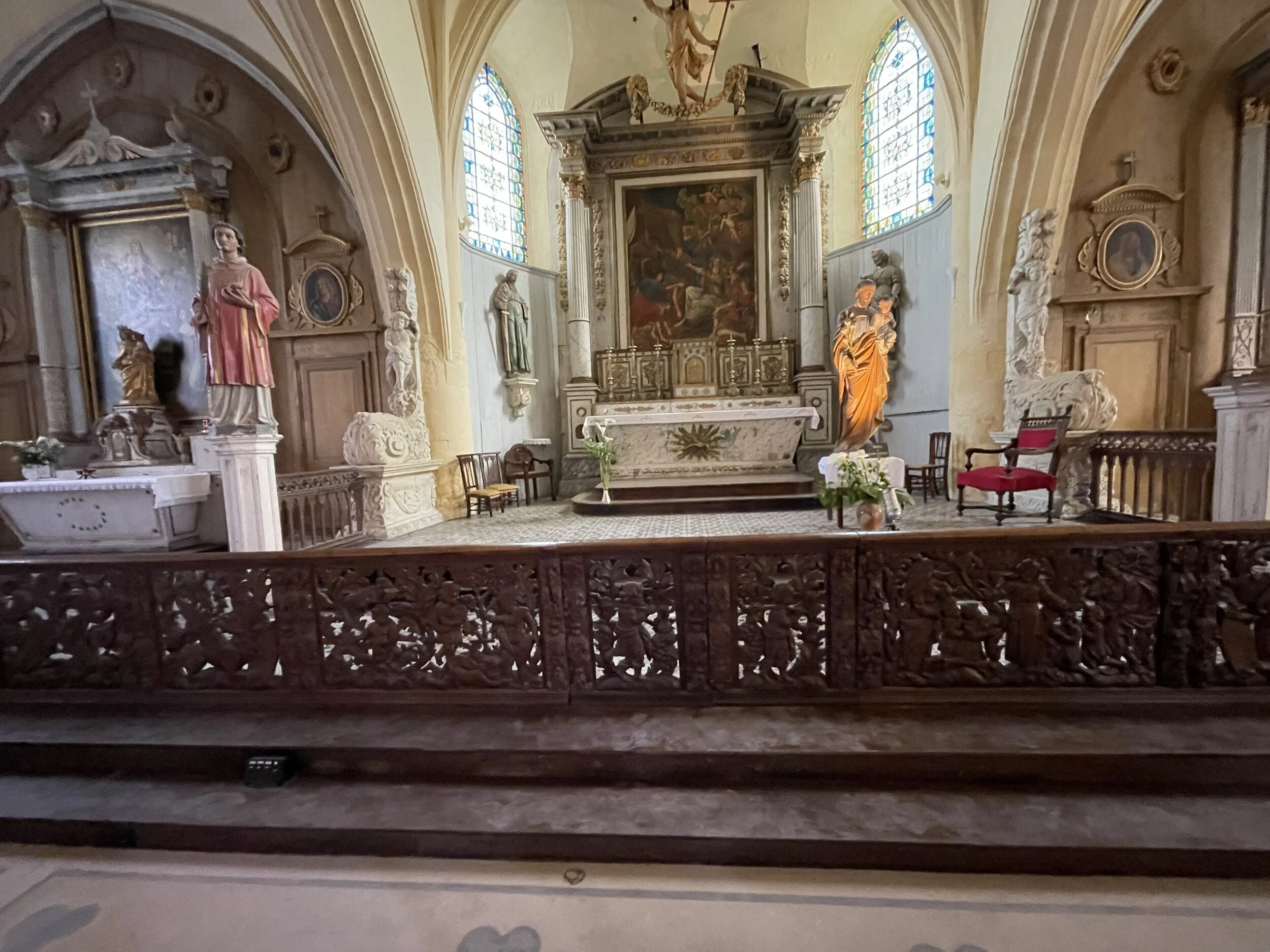 La partie centrale en chêne provenant assurément d’un atelier de qualité, est sculptée en façade. Elle semble plus ancienne (début XVIIème) que les parties latérales en bois de noyer. D’après l’inventaire topographique de 1979, il pourrait s’agir d’éléments de « boisure qui marquoit le maître-autel », en réalité un genre de clôture ou de jubé.