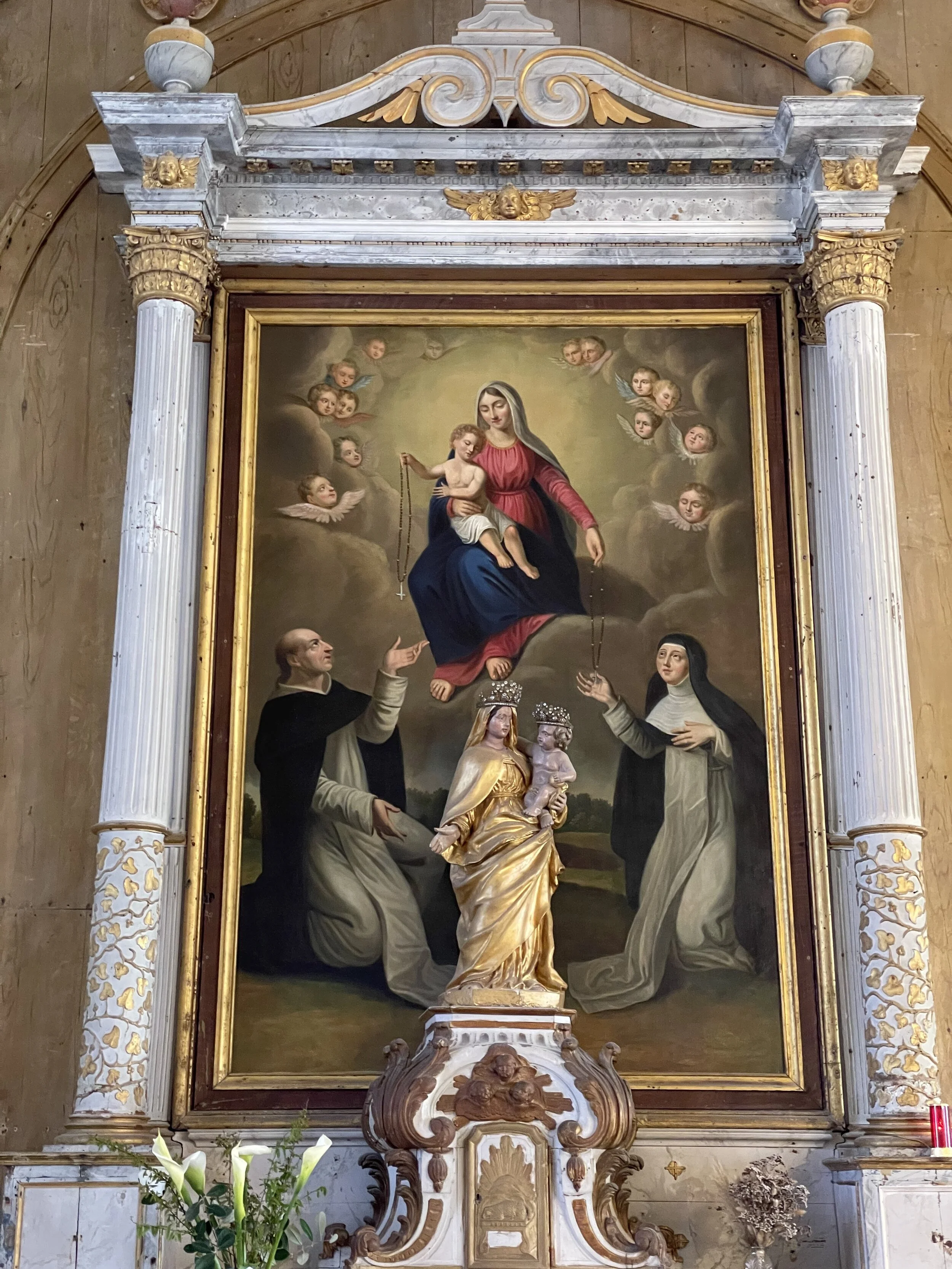 Le retable enserre un grand tableau du XIXème siècle qui représente la Donation du Rosaire à Saint Dominique et à Sainte Catherine de Sienne par la Sainte Vierge.
