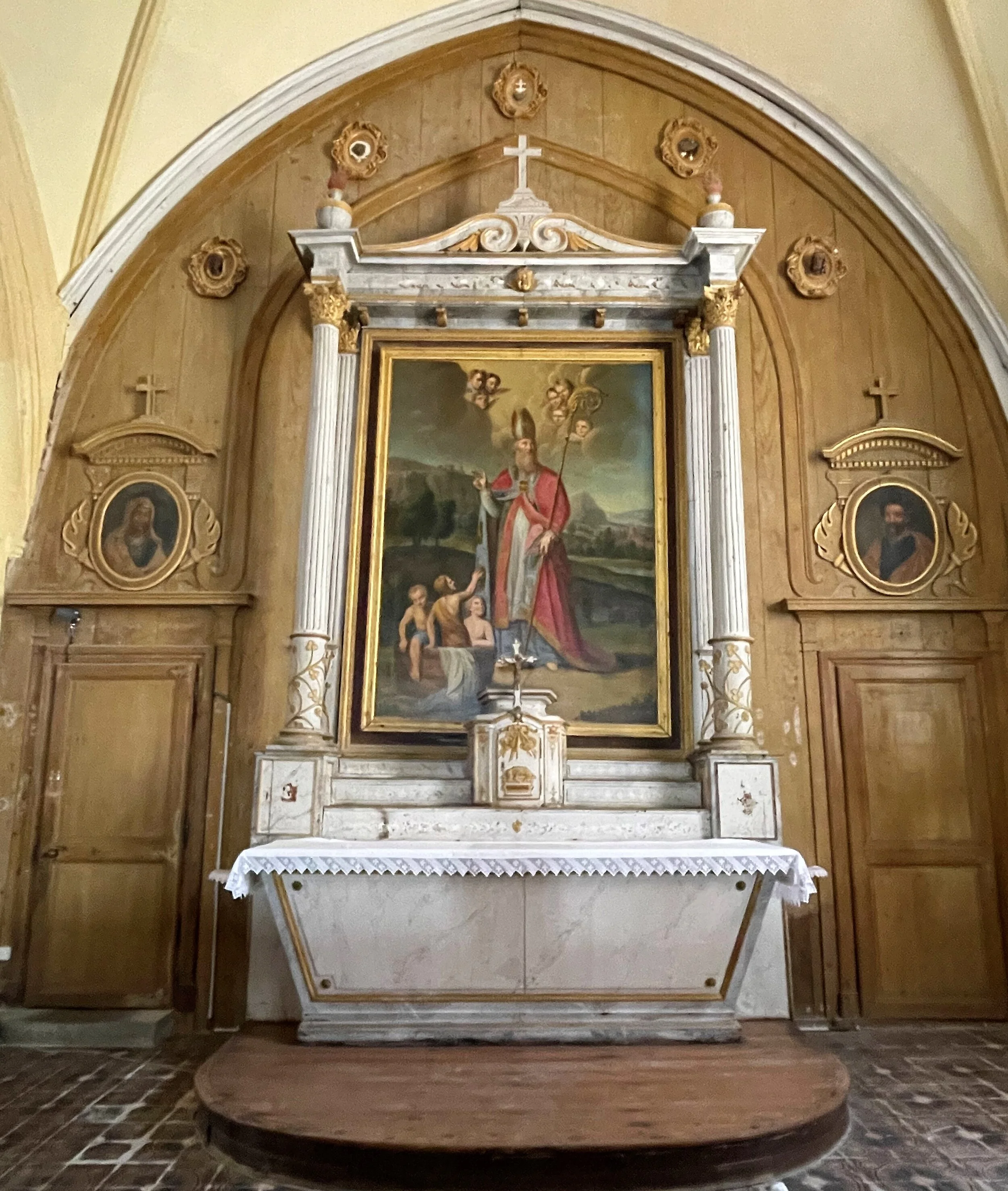 L’autel est entouré d’un retable à colonnes en bois peint en blanc et aux motifs sculptés rehaussés de peinture dorée. Au fronton, on remarque deux volutes affrontées surmontées d’une simple croix.